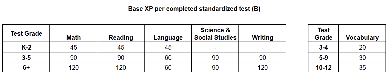 Each test already has a Base XP (B) value based on subject, grade, and test length. Performance-based tiers determine final XP: